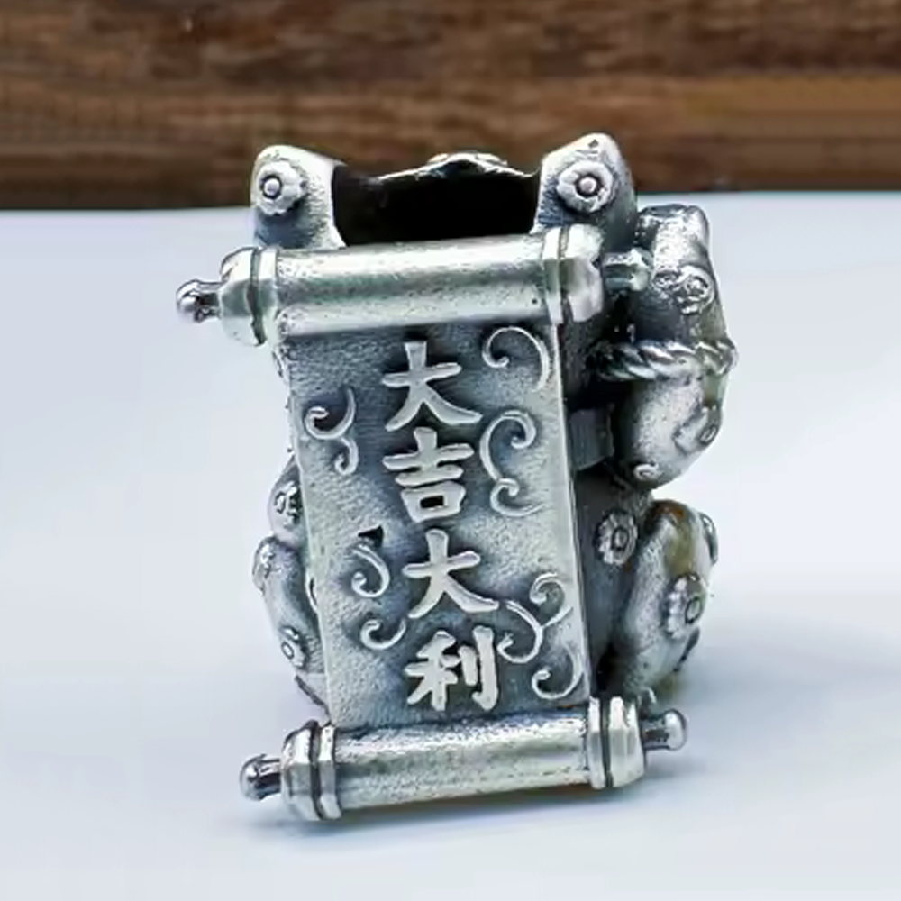 Хитра мордочка, впевнена поза й сувій на спині з ієрогліфами «大吉大利» — символом великої удачі та благополуччя.